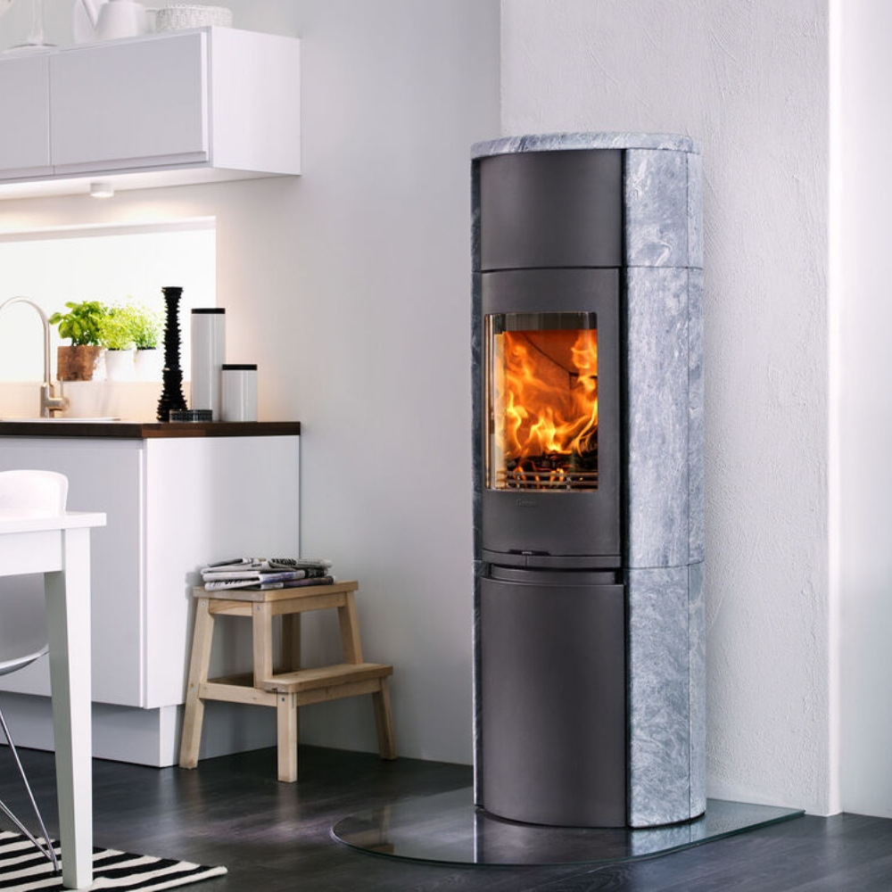 Vuolukivellä verhoiltu Contura-takka varaa lämpöä pitkään ja luovuttaa sitä tasaisesti. Täydellinen yhdistelmä tehokkuutta ja luonnonmateriaaleja.