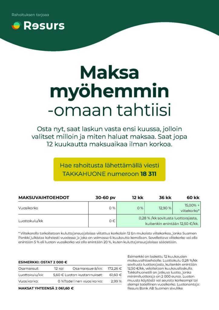 Huom! Kuluja veloitetaan vain käytetyltä luottoajalta. Jos sinulla on kysyttävää hakemuksesta, rahoitusvaihtoehdoista tai tiliehdoista, ole yhteydessä Resurs Bankin asiakaspalveluun Resurs (resursbank.fi)