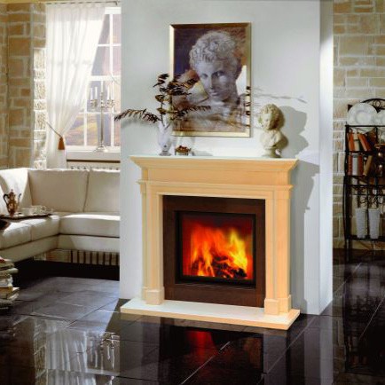 Hissiluukullisella takkasydämellä varustettu manttelitakka. Takka on suoran seinän malli. Takkaan valittavissa eri kivilajeja. Takassa Schmid Lina 7357 h takkasydän.