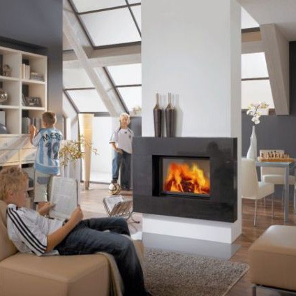 Moderni mantteli ja hissiluukullinen takkasydän. Takka on suoran seinän malli. Takkaan valittavissa eri kivilajeja. Takassa Schmid Lina 6751 h takkasydän.