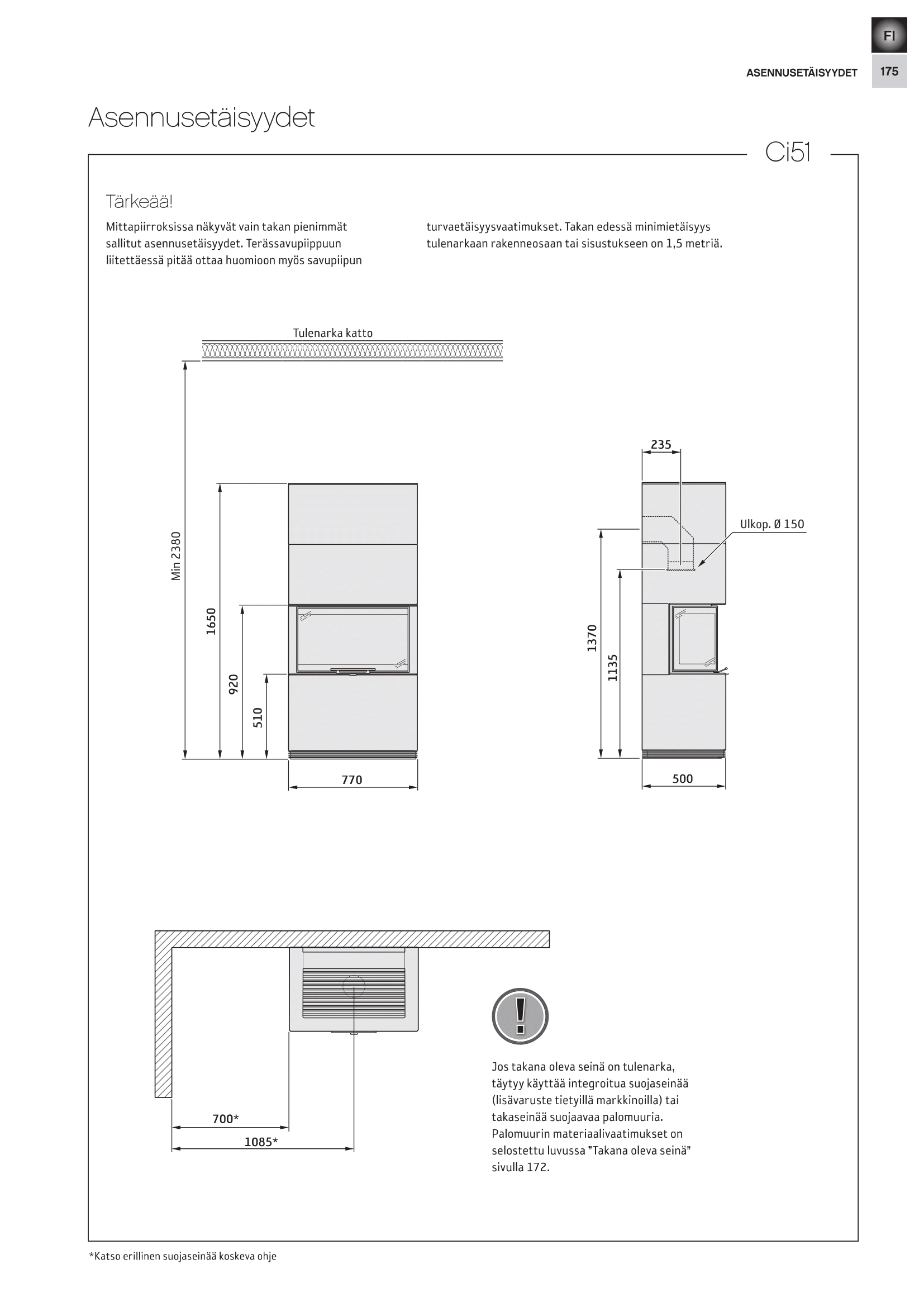 Voit myös sijoittaa takan jopa palavarakenteista taustaseinää vasten lisävarusteena saatavalla suojaseinäsarjalla