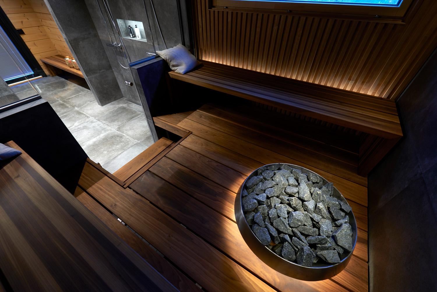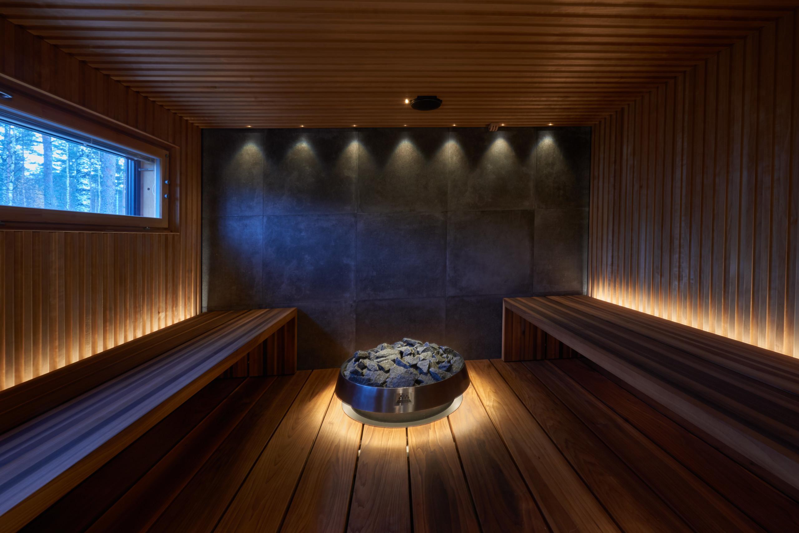 Eero Aarnion muotoilema Float-sähkökiuas 13,8 kW on tyylikkään futuristinen valaistuksen luodessa mielikuvaa ilmassa leijuvasta kiukaasta.
