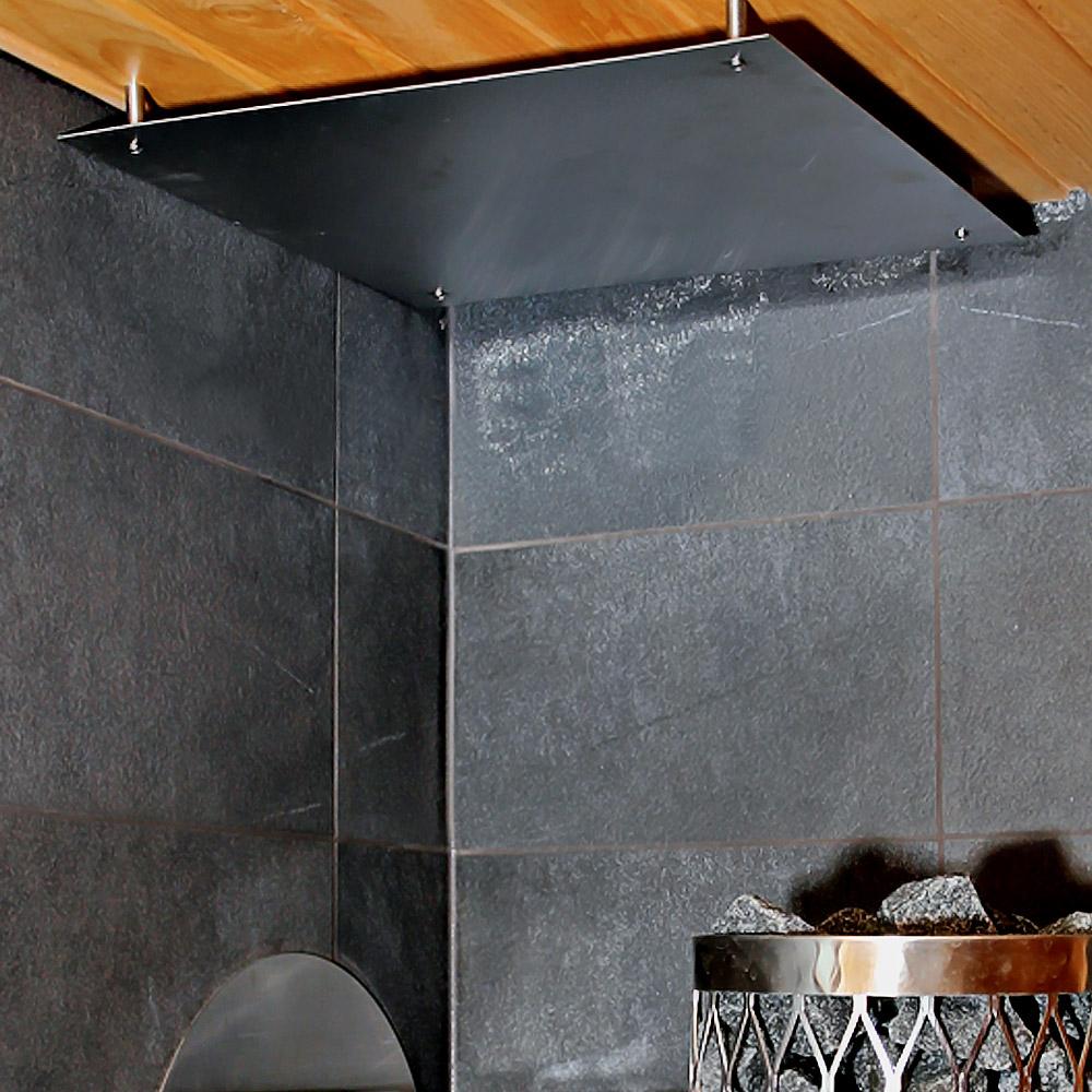Kattoon asennettavalla kiukaan RST-palosuojalevyllä puolitat suojaetäisyydet.