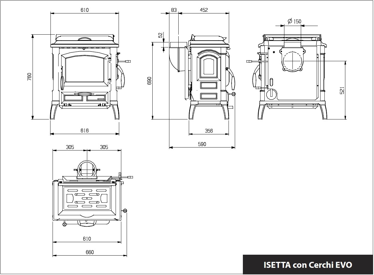 Isetta on huippulaadukas iso kamiina, jonka päällä on huipputehokas keittotaso. Keittotaso voidaan peittää kätevästi valurautaisella suojakannella. Erikoisuutena sivutäyttöluukku, josta voidaan myös lisätä polttopuita. 7,7 kW huipputeho tuottaa nopeasti ja erittäin tehokkaasti lämpöä. Huippuunsa hiottu jälkipoltto huolehtii että puusta ei ”jää jälkeäkään” erittäin tehokkaalla yli 80 % hyötysuhteellaan. Puu palaa myös kauan hyvien ilmansäätöjensa ansiosta. Vain takalähtö.