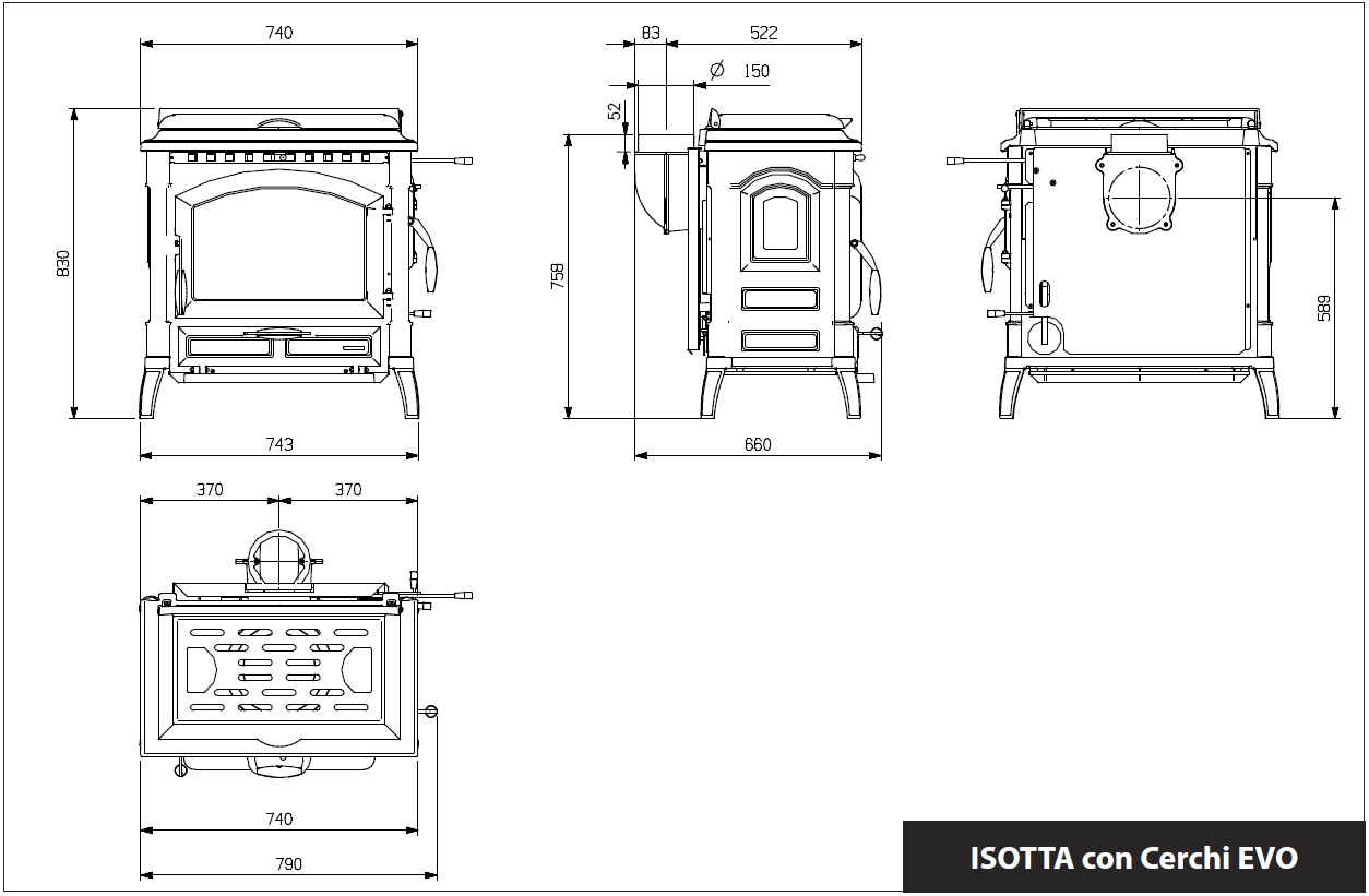 Isotta on huippulaadukas iso kamiina, jonka päällä on huipputehokas keittotaso. Keittotaso voidaan peittää kätevästi valurautaisella suojakannella. Erikoisuutena sivutäyttöluukku, josta voidaan myös lisätä polttopuita. Huikeat 11,9 kW huipputeho tuottaa nopeasti ja erittäin tehokkaasti lämpöä. Huippuunsa hiottu jälkipoltto huolehtii että puusta ei ”jää jälkeäkään” erittäin tehokkaalla yli 80 % hyötysuhteellaan. Puu palaa myös kauan hyvien ilmansäätöjensä ansiosta. Vain takalähtö, joka voidaan kääntää myös ylöspäin.