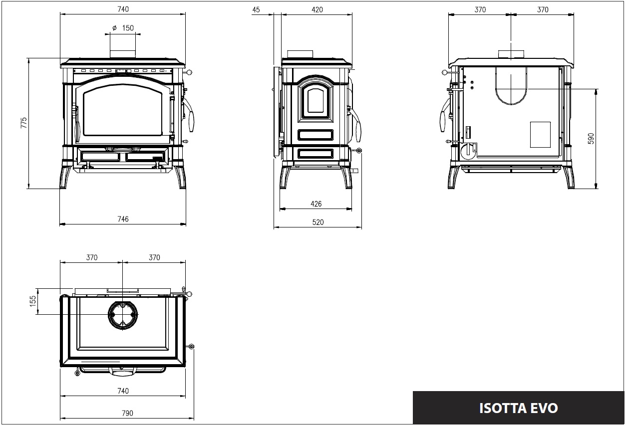 Isotta Evo on huippulaadukas iso kamiina. Erikoisuutena sivuluukku, josta myös puita voidaan lisätä. 7,7 kW huipputeho tuottaa nopeasti ja erittäin tehokkaasti lämpöä. Huippuunsa hiottu jälkipoltto huolehtii että puusta ei ”jää jälkeäkään” erittäin tehokkaalla yli 80 % hyötysuhteellaan. Puu palaa myös kauan hyvien ilmansäätöjensa ansiosta. Hormilähtö voidaan muuttaa päältä sekä takaa ylöspäin tai takaa taakse.