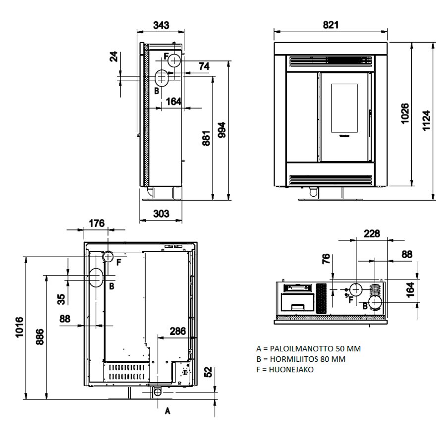 Helppokäyttöinen iso LCD näyttöpaneeli ilmoittaa nykyisen takan mittaaman huonelämpötilan, ja lämpötilaa voidaan säätää helposti + ja – näppäimillä. Tehoalueella 1-5 voit säätää takan tuottamaa lämpötehoa helposti + ja – näppäimillä. Yksinkertainen ja helppo valikkorakenne. Rullaavat tekstit valikoissa. Takassa vakiona huonetermostaattianturi lyhyellä johdolla (pituus jatkettavissa)