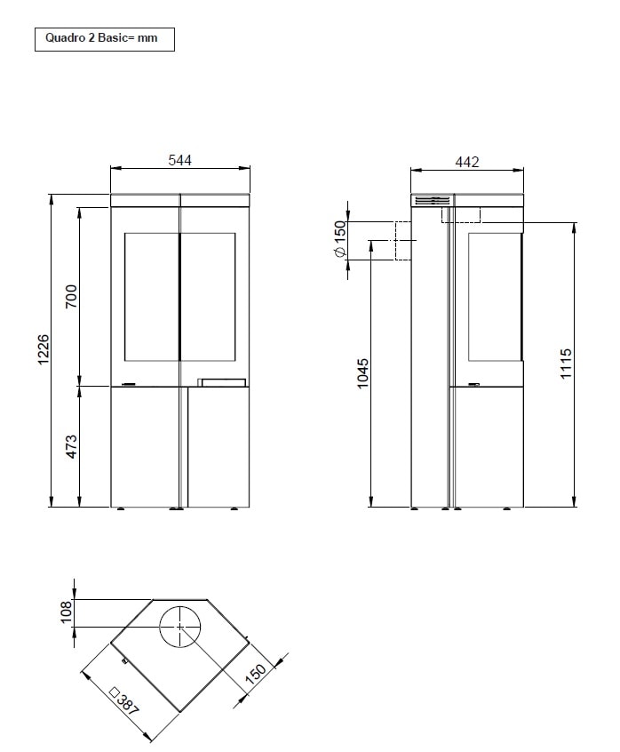 Nordpeis Quadro 2 Basic on kulmaluukkuinen kamina, joka kuuluu Nordpeisin Quadro-kamiinamallistoon.