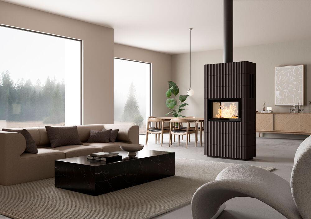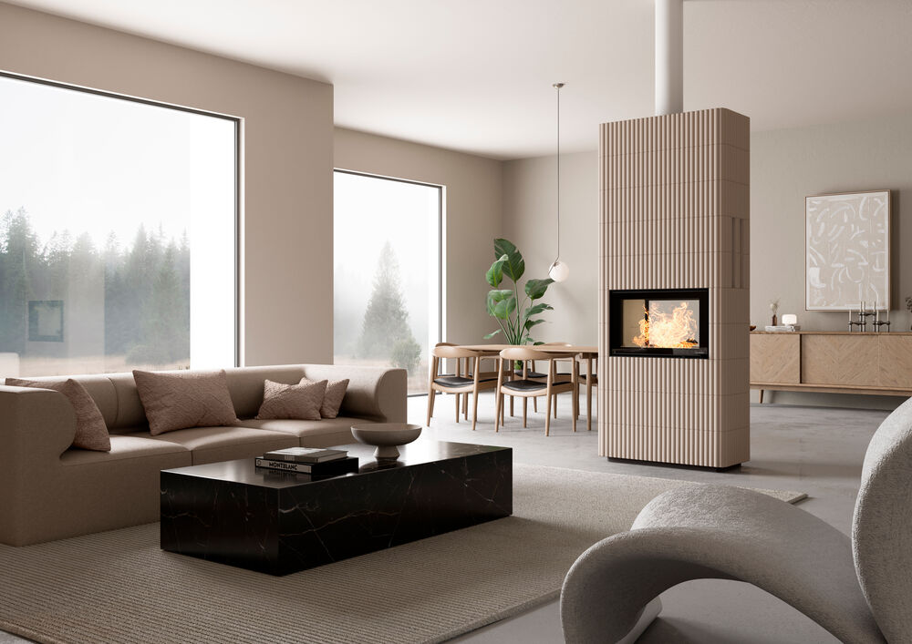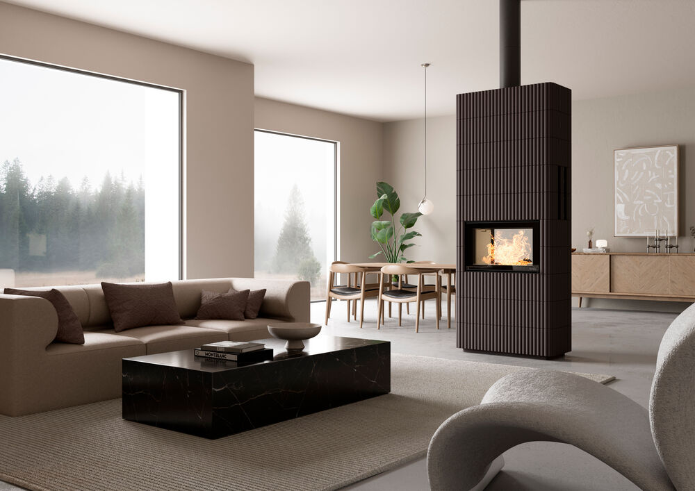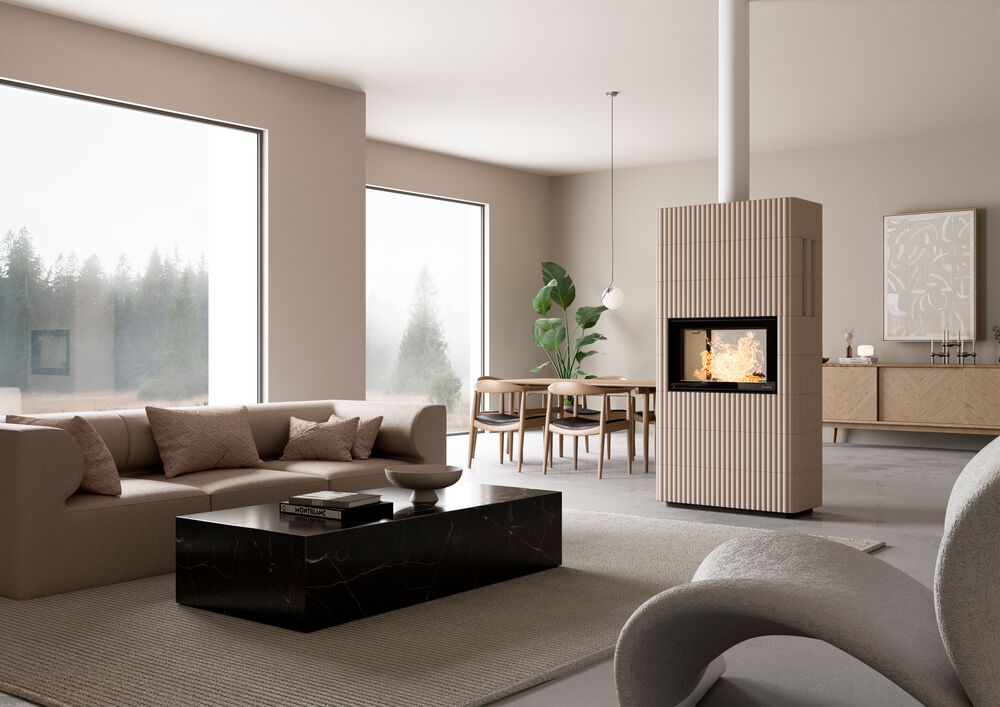 Tunneliratkaisun ansiosta takkatuli näkyy takan molemmilta puolilta