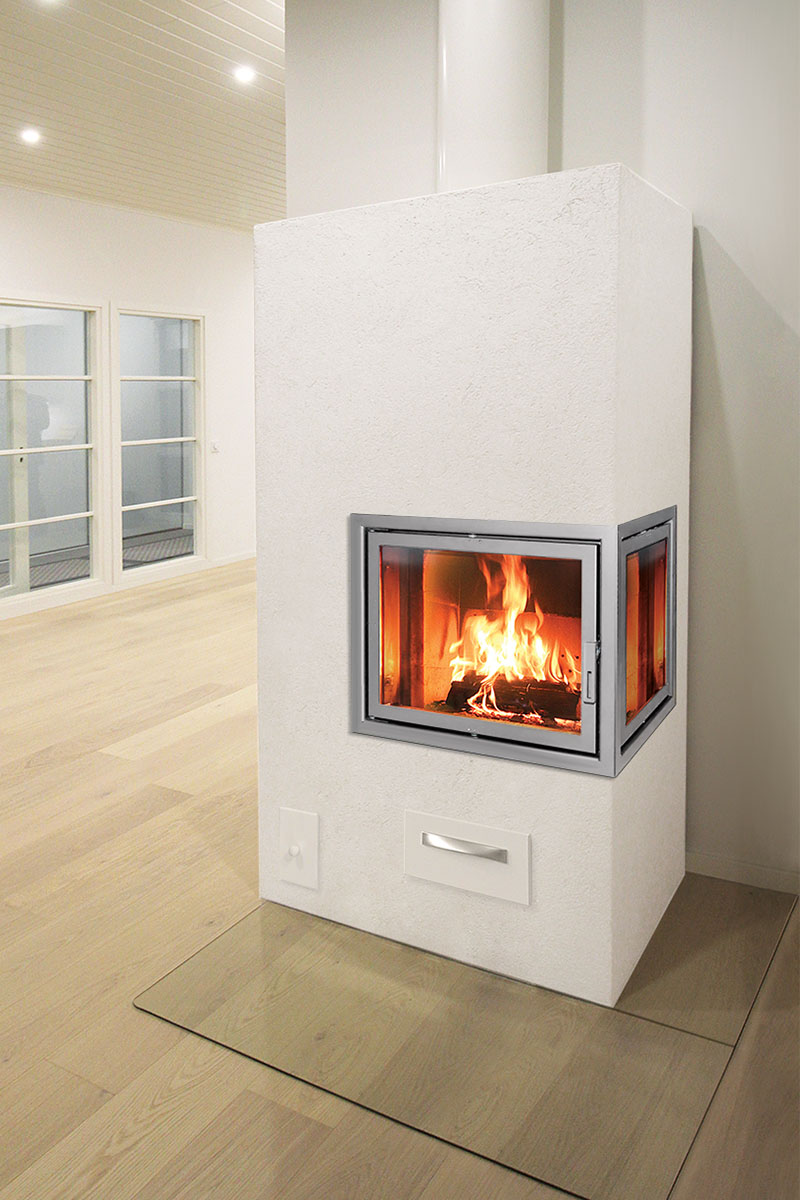 Tyylikäs ja moneen tilaan sopiva Valkea 85 Basic kulmaluukulla avaa upean näkymän tulipesään kahdelta suunnalta ison lasisen kulmaluukun lävitse. 85 senttiä leveään varaavaan takkaan saa lisää varauskykyä korotuskerrosten avulla.